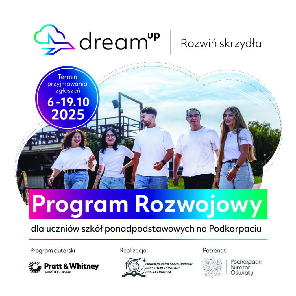 Przyszłość młodych ludzi kryje w sobie ogromny potencjał – wystarczy tylko odpowiednie wsparcie, by marzenia zamieniły się w realne działania. Właśnie z tą myślą powstał DreamUp – autorski program rozwojowy firmy Pratt & Whitney w Rzeszowie, największej firmy lotniczej w Polsce. To inicjatywa, która otwiera przed młodzieżą drzwi do nowoczesnych branż, rozwija kompetencje przyszłości i pokazuje, że globalne możliwości są w zasięgu ręki.