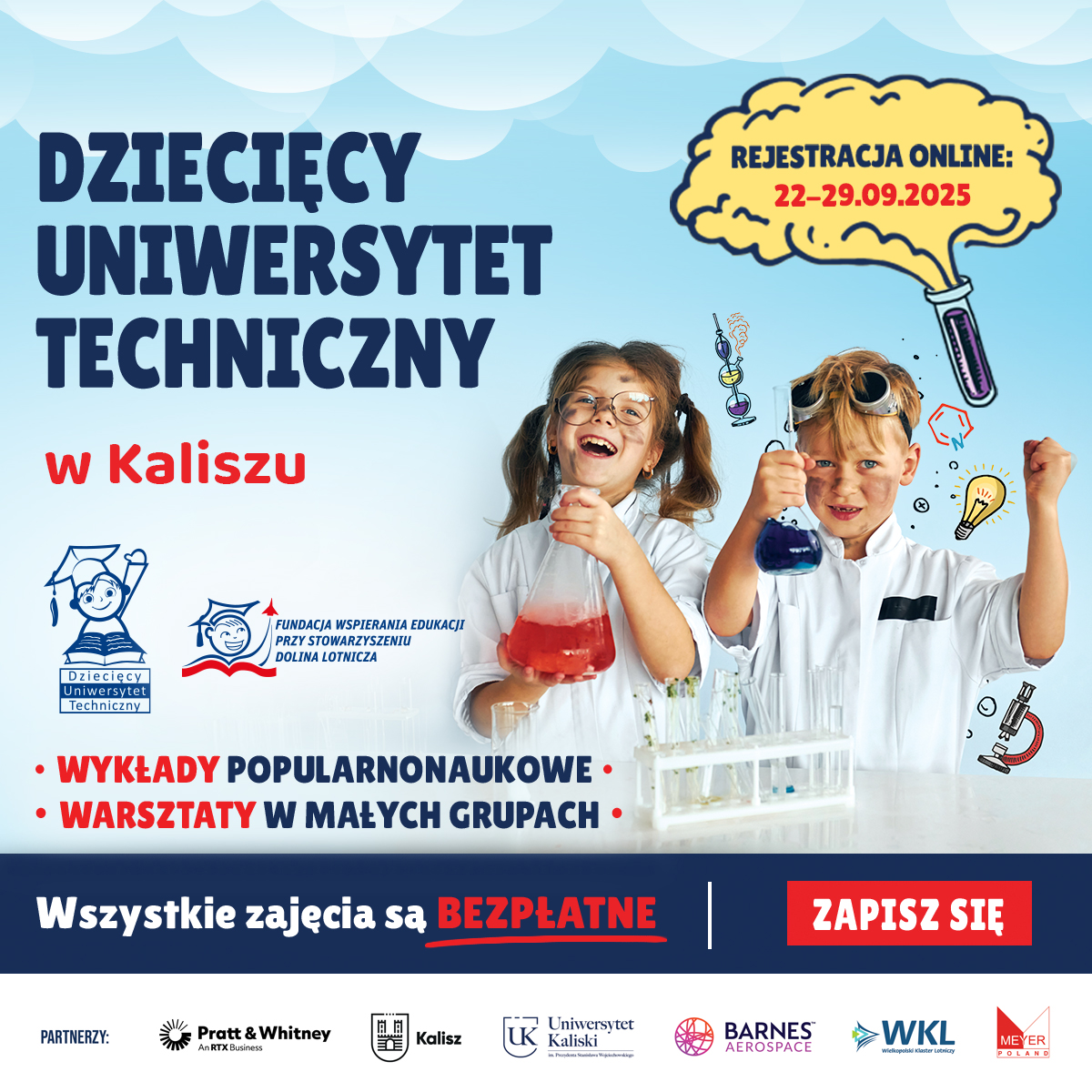 Do 29 września 2025 r. trwa rekrutacja do Dziecięcego Uniwersytetu Technicznego (DUT) w Kaliszu. To już czwarta edycja wyjątkowych zajęć dla dzieci w wieku 7–12 lat, które łączą naukę, zabawę i fascynujące eksperymenty Dlaczego warto? DUT to projekt, który od pierwszej edycji cieszy się ogromnym zainteresowaniem uczniów i rodziców. Uczestnicy podkreślają, że zajęcia są interaktywne, inspirujące i pełne niespodzianek. Dzięki pokazom, doświadczeniom i warsztatom dzieci mają okazję samodzielnie odkrywać świat…