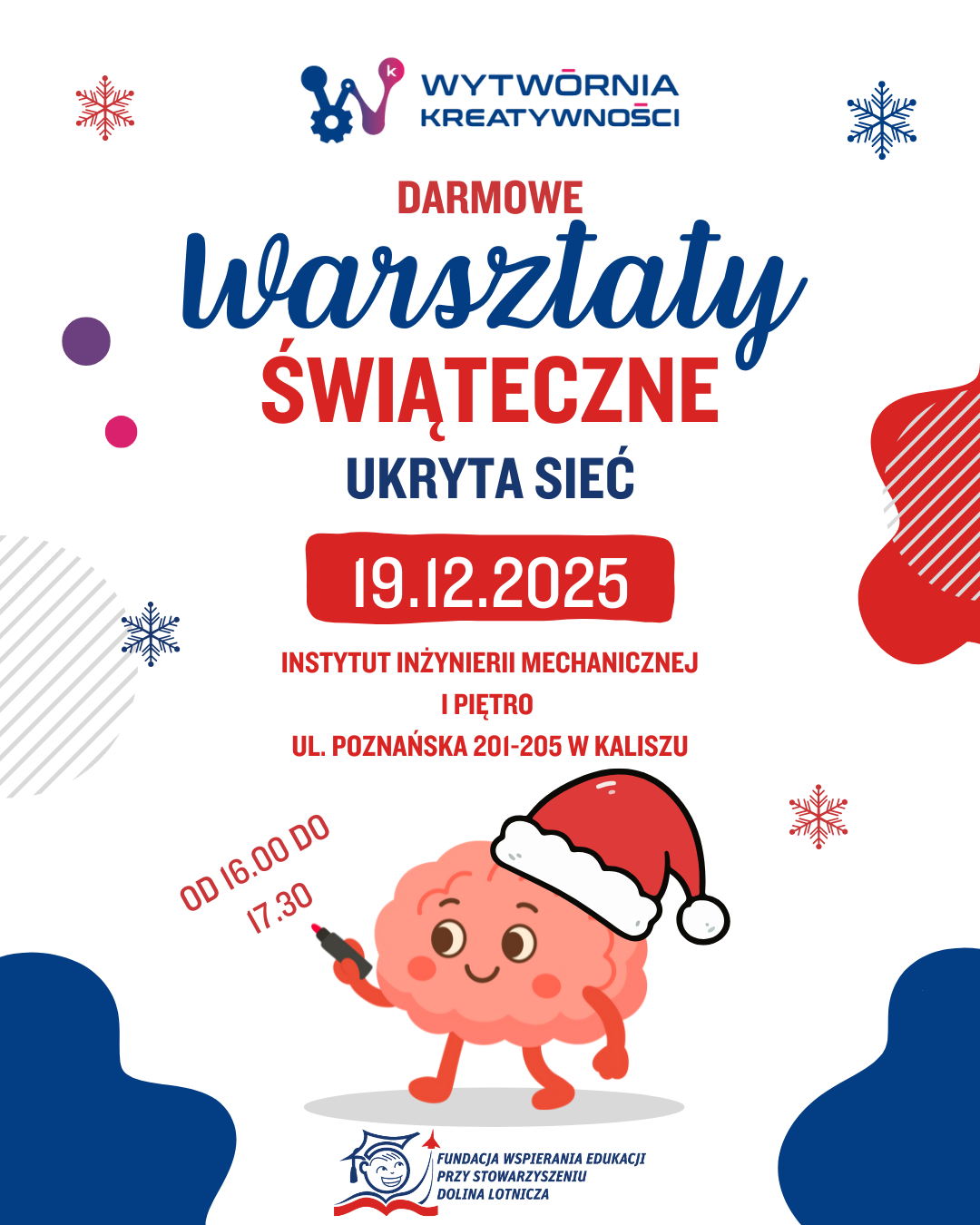Zapraszamy do udziału w bezpłatnym wydarzeniu „Warsztaty zimowe w Wytwórni Kreatywności”! To niepowtarzalna okazja wziąć udział w niektórych wydarzeniach, które w tym roku organizowała nasza Fundacja. Jesteś zainteresowany zadaniami i symulatorem lotu w Wytwórni Kreatywności? Zastanawiasz się jak wyglądają warsztaty Dziecięcego Uniwersytetu Technicznego w Kaliszu? Wypełnij formularz i odkryj zupełnie inne spojrzenie na naukę dzięki przygotowanym aktywnością – a to wszystko w wyjątkowej zimowej atmosferze! Wydarzenie odbędzie się 19 grudnia…